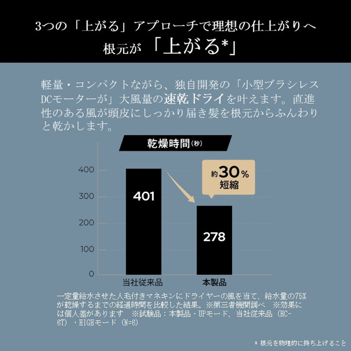 独自モーターが大風量の速乾ドライを実現。 軽量・コンパクトながら、大風量を実現する独自開発の小型ブラシレスDCモーターが、ドライ時間を約30%短縮。